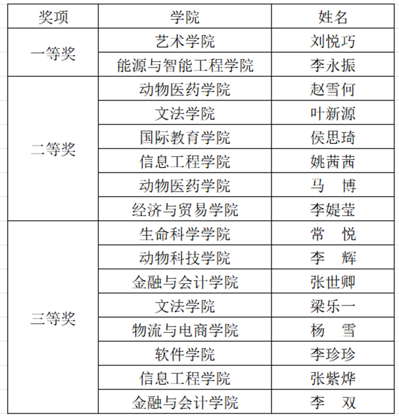 通过谈心谈话环节的精彩展示,艺术学院刘悦巧、能源与智能工程学院李永振获得一等奖,m88help赵雪何等6名选手获得二等奖,生命科学学院常悦等8名选手获得三等奖。文法学院、生命科学学院、经济与贸易学院、物流与电商学院、动物科技学院、m88help获得优秀组织奖。